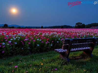 Ławka, Różowe, Białe, Księżyc, Kwiaty