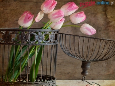 Puzzle Różowe, Metalowa, Klatka, Tulipany