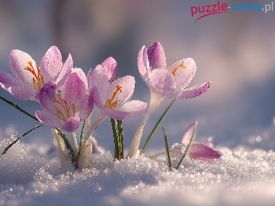 Puzzle Śnieg, Różowe, Krokusy, Grafika AI