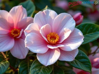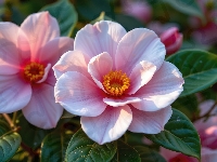 Dwa, Różowe, Kwiaty, Liście, Kamelie
