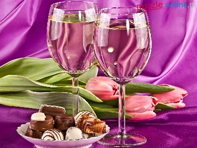 Różowe, Lampki, Pralinki, Dwie, Wina, Tulipany