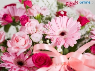 Puzzle Różowe, Bukiecik, Wstążki, Kwiaty