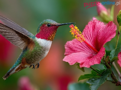Różowy, Koliber, Ptak, Lot, Hibiskus, Łodyga, Grafika AI, Kwiat, Pąki