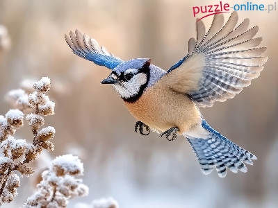 Ośnieżona, Lot, Modrosójka, Rozpostarte, Roślina, Skrzydła