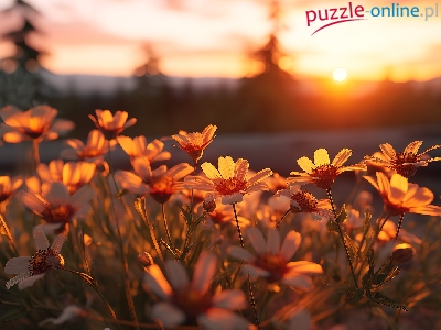 Puzzle Łąka, Rozświetlone, Kwiaty, Zachód słońca