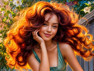 Kobieta, Rudowłosa, Loki, Grafika, Kwiaty