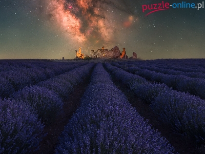 Villares del Saz, Hiszpania, Gwiazdy, Lawenda, Ruiny, Droga mleczna, Pole, Niebo