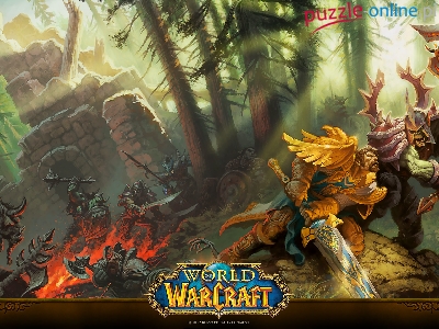 Ogień, Gra, Walka, Plakat, Las, World of Warcraft, Postacie, Ruiny, Orki, Rycerze