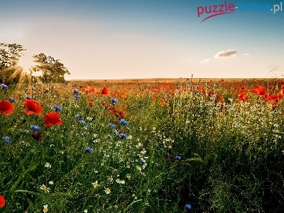 Rumianki, Maki, Słońca, Łąka, Chabry, Promienie