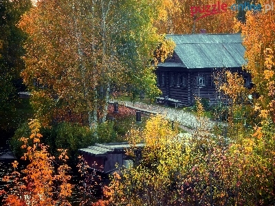 Puzzle Rzeczka, Jesień, Dom, Drzewa