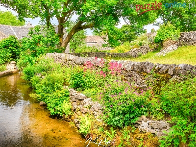 Domy, Rzeczka, Drzewa, Murek, Kwiaty