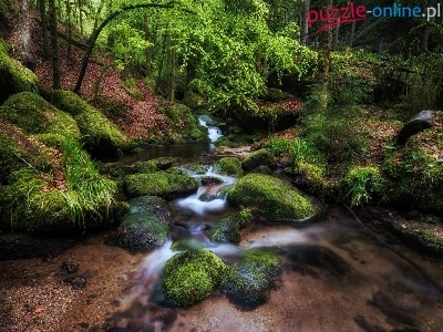 Rzeczka, Mech, Las, Drzewa, Kamienie