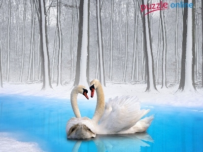 Rzeka, Śnieg, Dwa, Łabędzie, Drzewa