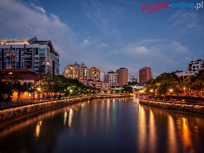 Rzeka, Chmur, Nocą, Drapacze, Budynki, Singapur