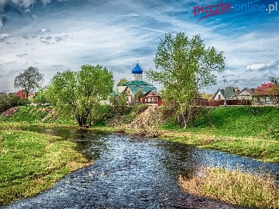 Rzeka, Domy, Psków, Cerkiew, Drzewa