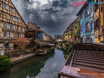 Pochmurne, Niebo, Domy, Alzacja, Colmar, Kanał, Francja, Rzeka