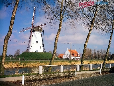 Puzzle Rzeka, Wiatrak, Domy, Drzewa