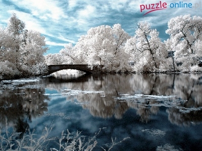 Rzeka, Zima, Białe, Drzewa, Mostek