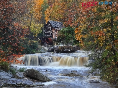 Puzzle Rzeka, Jesień, Drzewa, Młyn
