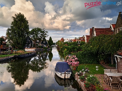 Łódki, Miasto Edam, Holandia, Kanał wodny, Domy, Rzeka