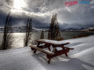 Puzzle Rzeka, Chmury, Góry, Ławka