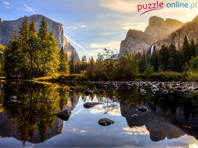 Stan Kalifornia, Rzeka, Drzewa, Góry, Stany Zjednoczone, Park Narodowy Yosemite, Kamienie