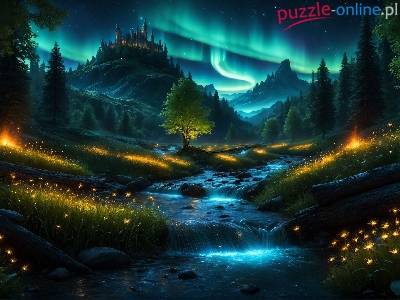 Zamek, Góry, Grafika, Rzeka, Drzewa, Zorza polarna