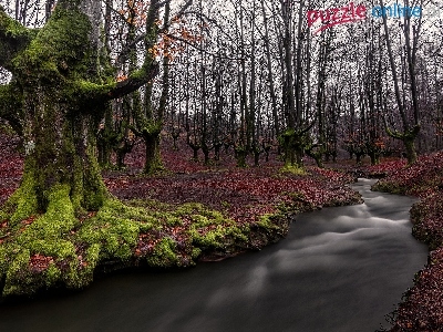 Rzeka, Las, Mech, Hiszpania, Jesień, Drzewa