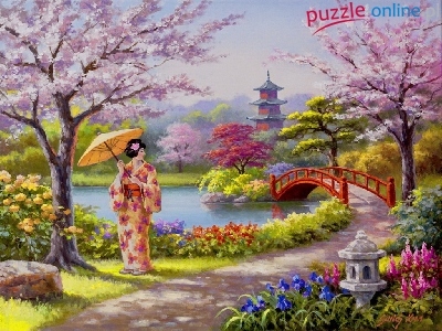 Rzeka, Japonka, Kwiaty, Ogród, Kobieta, Most