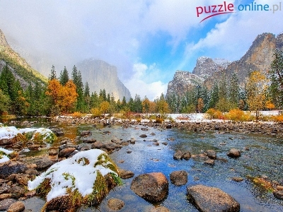 Rzeka, Śnieg, Góry, Las, Pierwszy