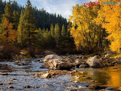 Kamienie, Rzeka Truckee, Drzewa, Stany Zjednoczone, Jesień, Las