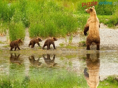 Rzeka, Z, Odbicie, Niedźwiedź, Młodymi, Trawa