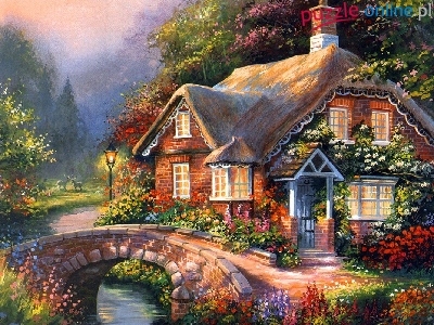 Puzzle Rzeka, Dom, Most, Kwiaty
