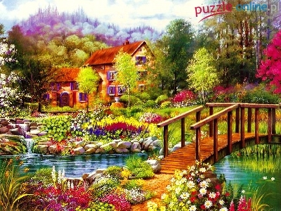 Rzeka, Kwiaty, Ogród, Mostek, Dom