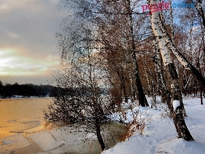 Puzzle Rzeka, Brzozy, Śnieg, Kra