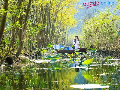 Puzzle Rzeka, Dziewczyna, Łódka, Drzewa