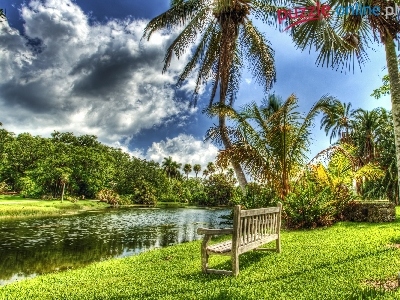 Puzzle Ławka, Palmy, Rzeka, Drzewa