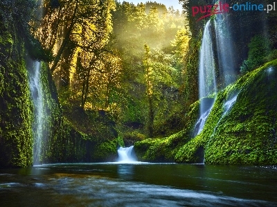 Puzzle Rzeka, Las, Wodospad, Przebijające Światło