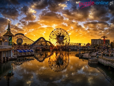 Kalifornia, Diabelski młyn, Zachód słońca, Disneyland, Stany Zjednoczone, Anaheim, Rzeka