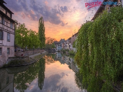 Puzzle Rzeka, Zachód, Słońca, Domy