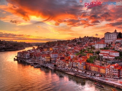 Puzzle Rzeka, Zachód, Słońca, Domy