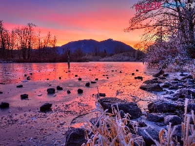 Rzeka, Góry, Zachód, Słońca, Kamienie