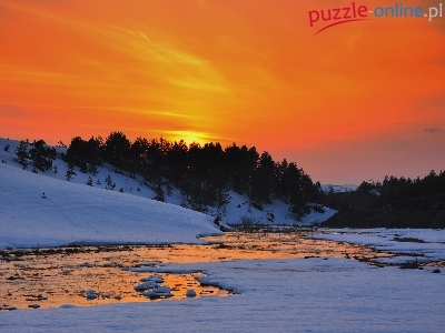 Rzeka, Śnieg, Zachód, Słońca, Lasy