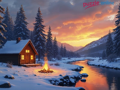 Rzeka, Dom, Zima, Ognisko, Drzewa, Zachód słońca, Góry, Śnieg, Niebo