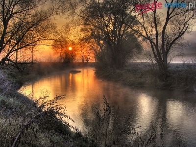 Rzeka, Słońca, Oszroniona, Trawa, Zachód