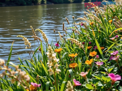 Rzeka, Kwiaty, Trawy, Grafika