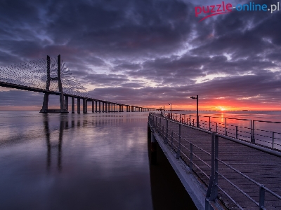 Lizbona, Portugalia, Vasco da Gama, Zachód słońca, Niebo, Most, Rzeka Tag, Chmury