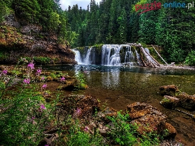 Wodospad Lower Lewis River Falls, Stany Zjednoczone, Osada Cougar, Skały, Drzewa, Rzeka, Las, Stan Waszyngton