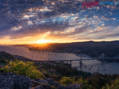 Domy, Góry, Zachód słońca, Chmury, Most, Zatoka, Krzewy, Drzewa, Rzeka, Vigo, Hiszpania