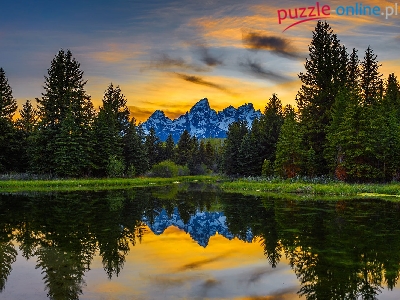 Park Narodowy Grand Teton, Drzewa, Wyoming, Stany Zjednoczone, Odbicie, Góry, Teton Range, Zachód słońca, Snake River, Rzeka